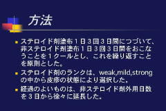 方法は、ステロイド剤塗布1日3回3日間に続いて、非ステロイド剤塗布1日3回3日間をおこなうことを1クールとし、これを繰り返すことを原則としました。