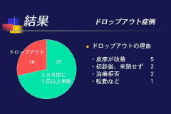 ドロップアウト症例は10例で、その内訳は、皮疹が改善したために来院しなくなったと思われるもの5例。初診のあと、来院しなかった症例2例。ステロイド拒否など当院での治療を拒否したもの2例。転勤のため1例、です。