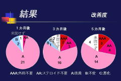 治療1カ月後から8割以上の例で良好なコントロールが得られました。注目していただきたいのは、3カ月後、5カ月後と経過するに従って、ステロイド不要例、外用不要例が増えていることです。