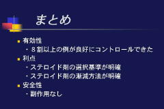 この方法の利点は、使用すべきステロイド剤の強さの選択基準が明確であることと、ステロイド剤の漸減方法が明確であることです。